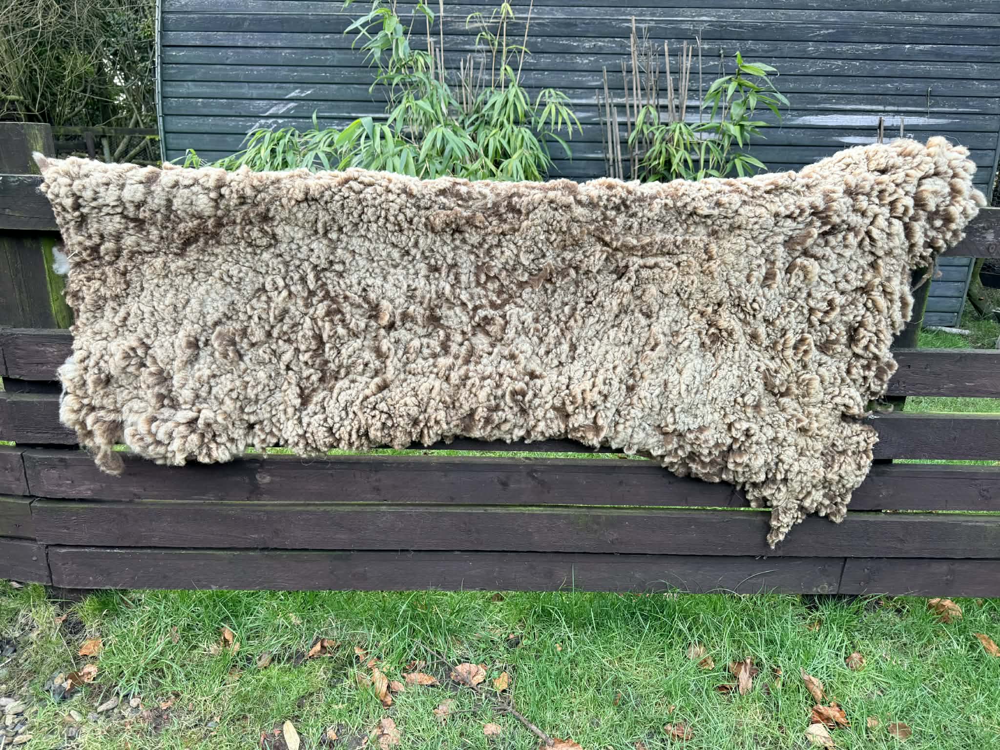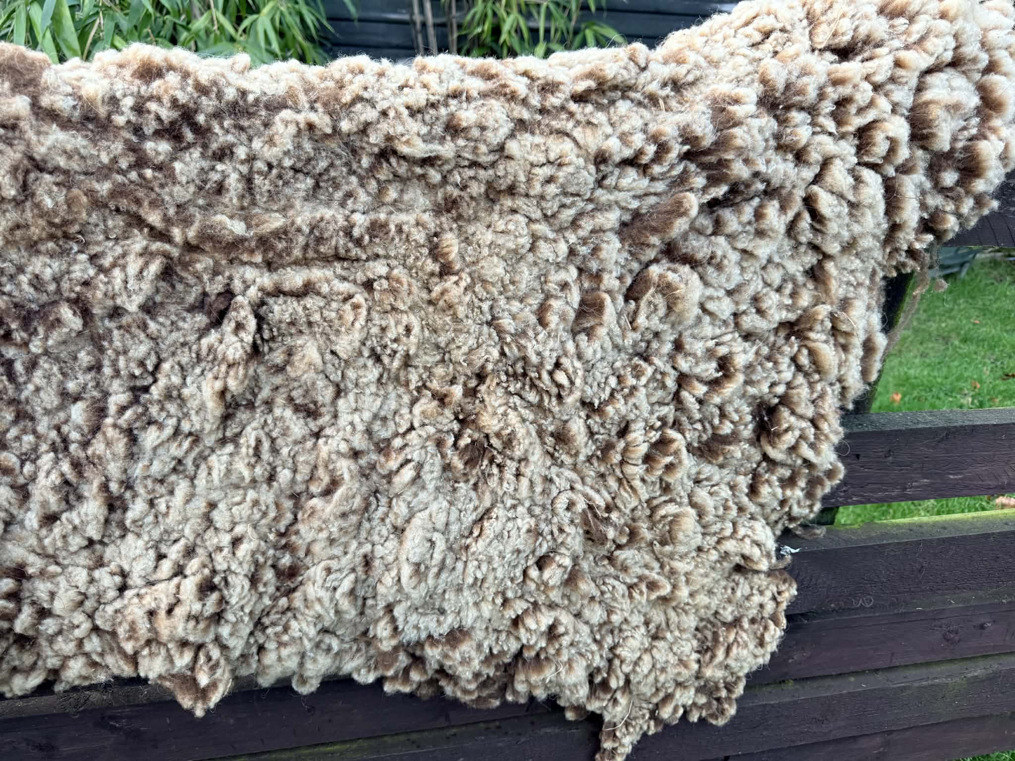 The rug is then skirted, removing as much hay etc as possible from it, along with any dirty fleece. Its prepared and then hand felted using online soap and water. The process is very labour intensive.