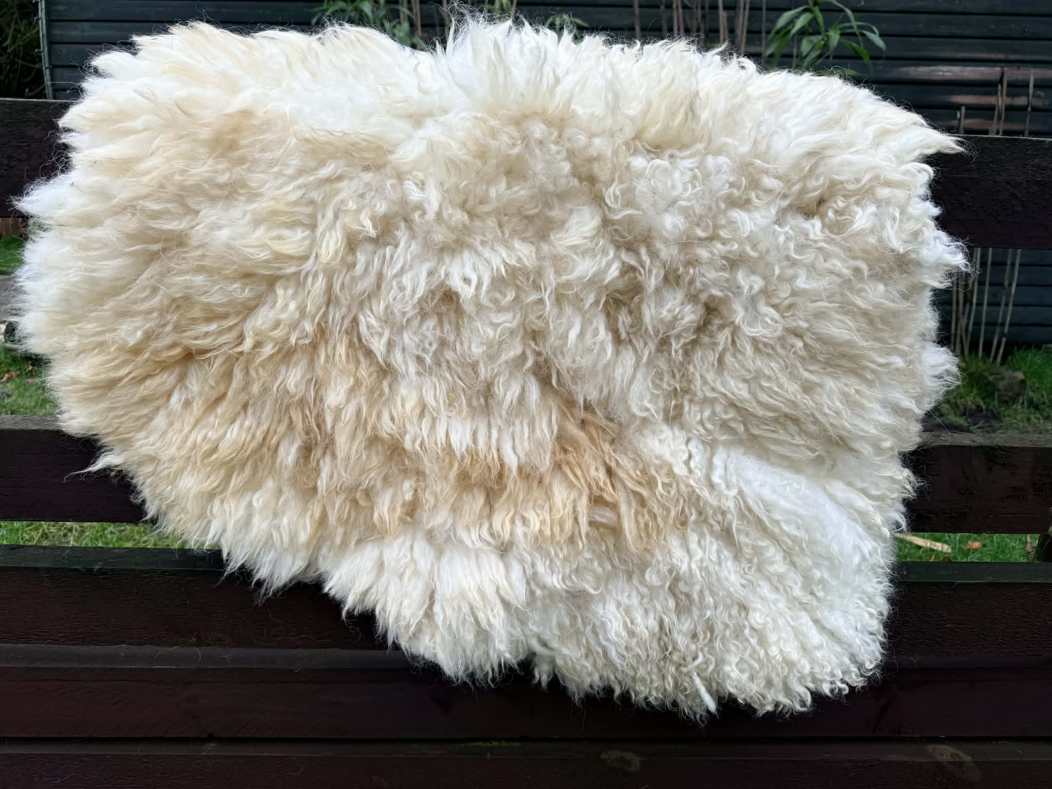 The rug is then skirted, removing as much hay etc as possible from it, along with any dirty fleece. Its prepared and then hand felted using online soap and water. The process is very labour intensive.