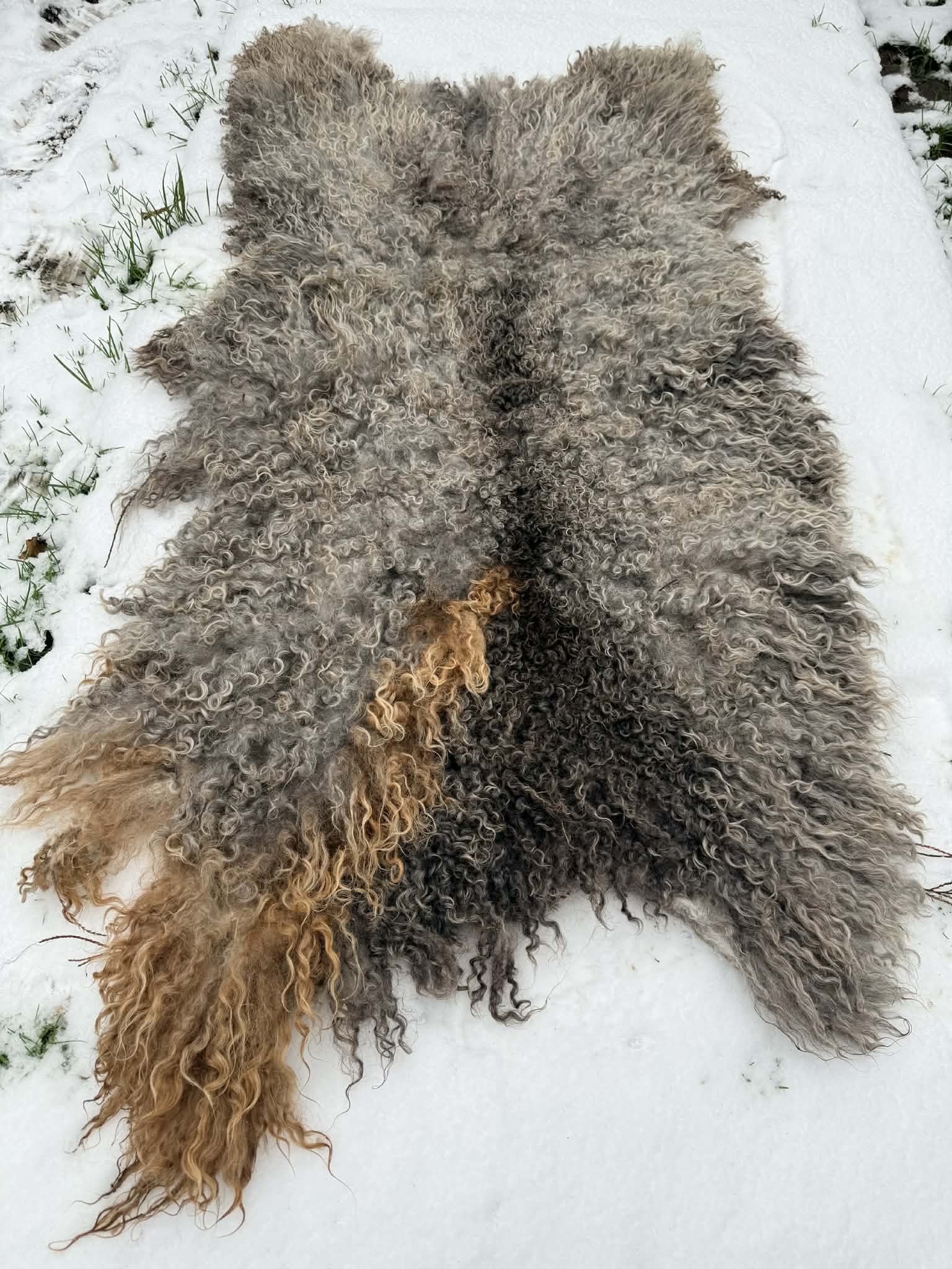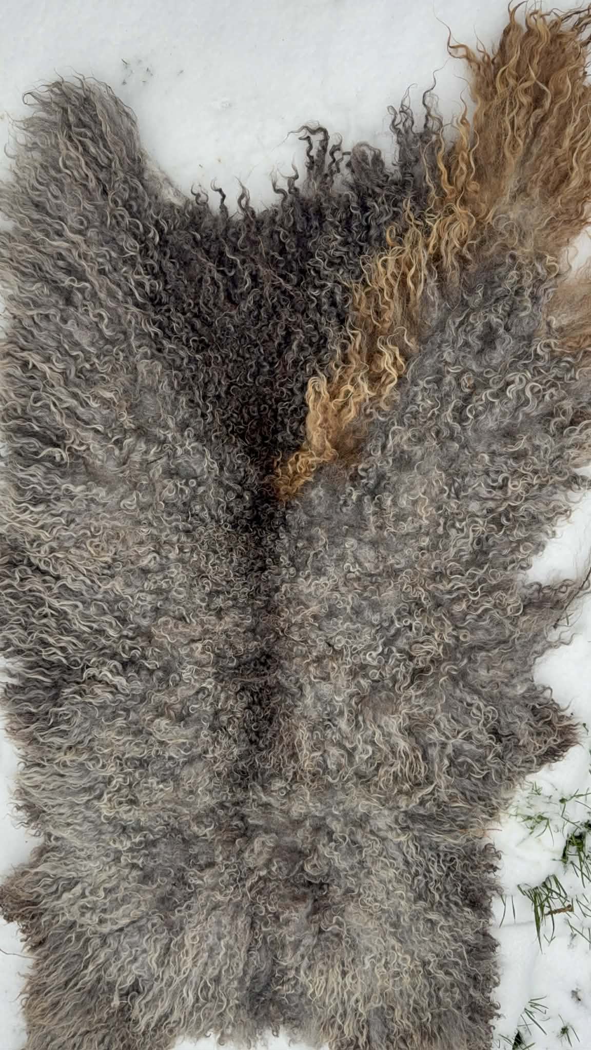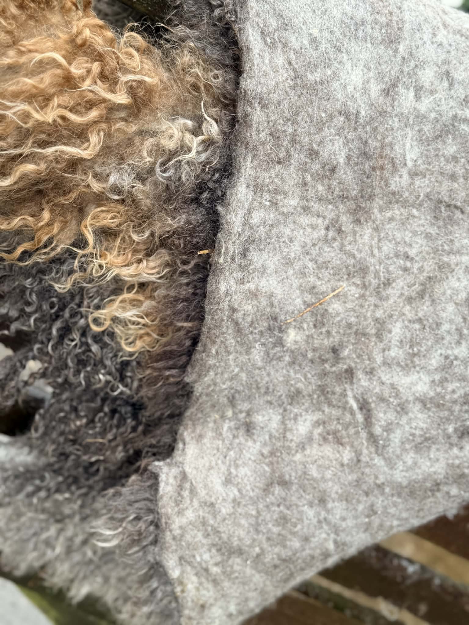 Every year their fleece changes colour, last years shear is much lighter, a stunning rug, for some reason nova acquired a brown stripe over the years. This fleece was her last years shear 2025