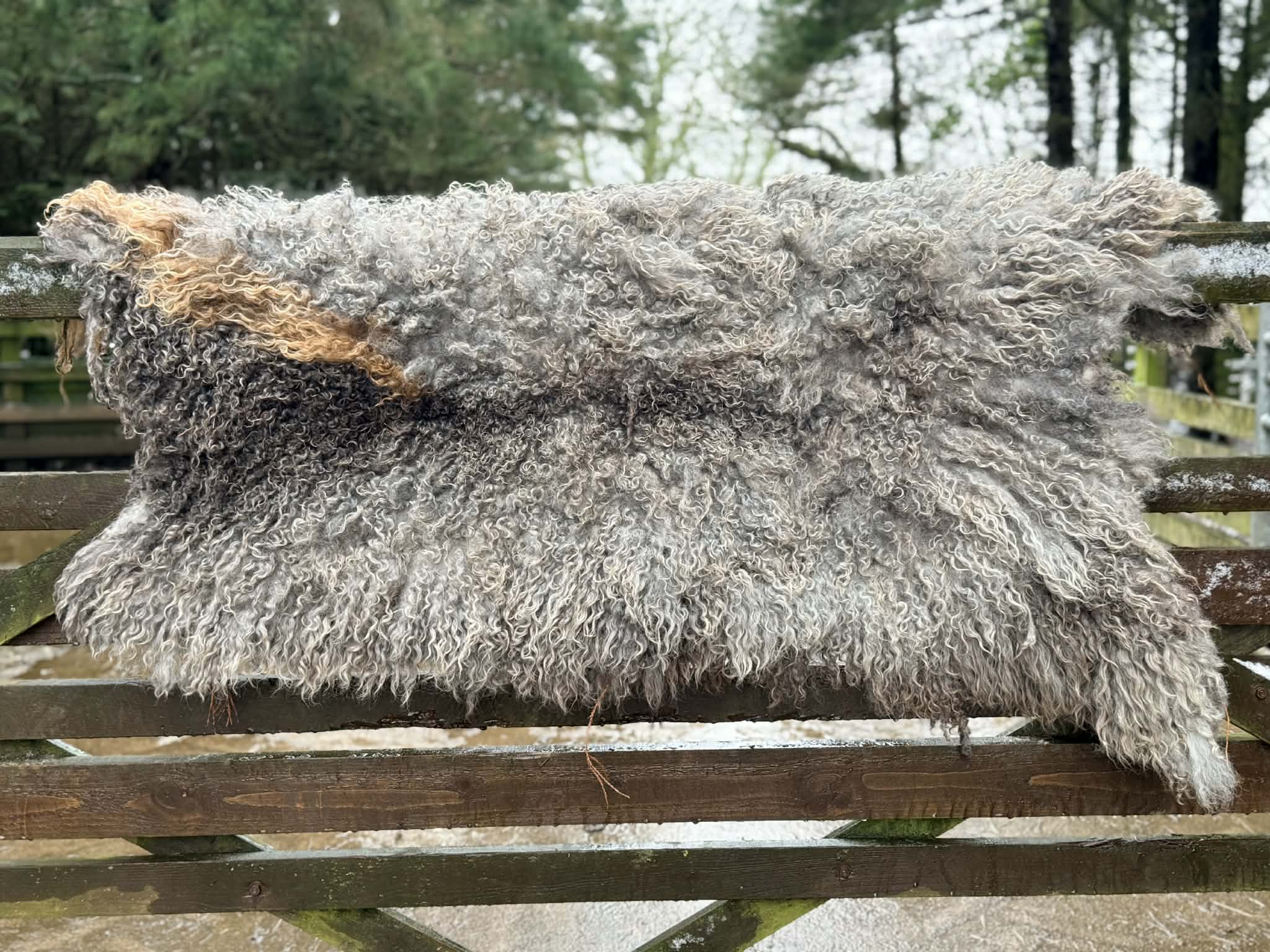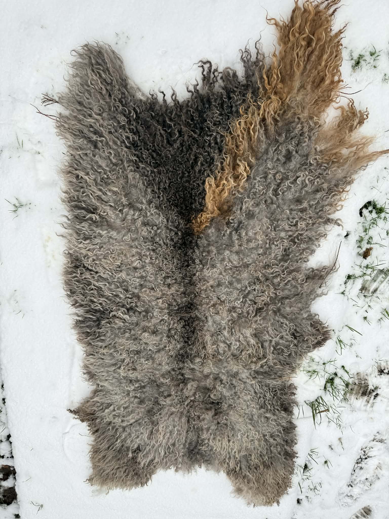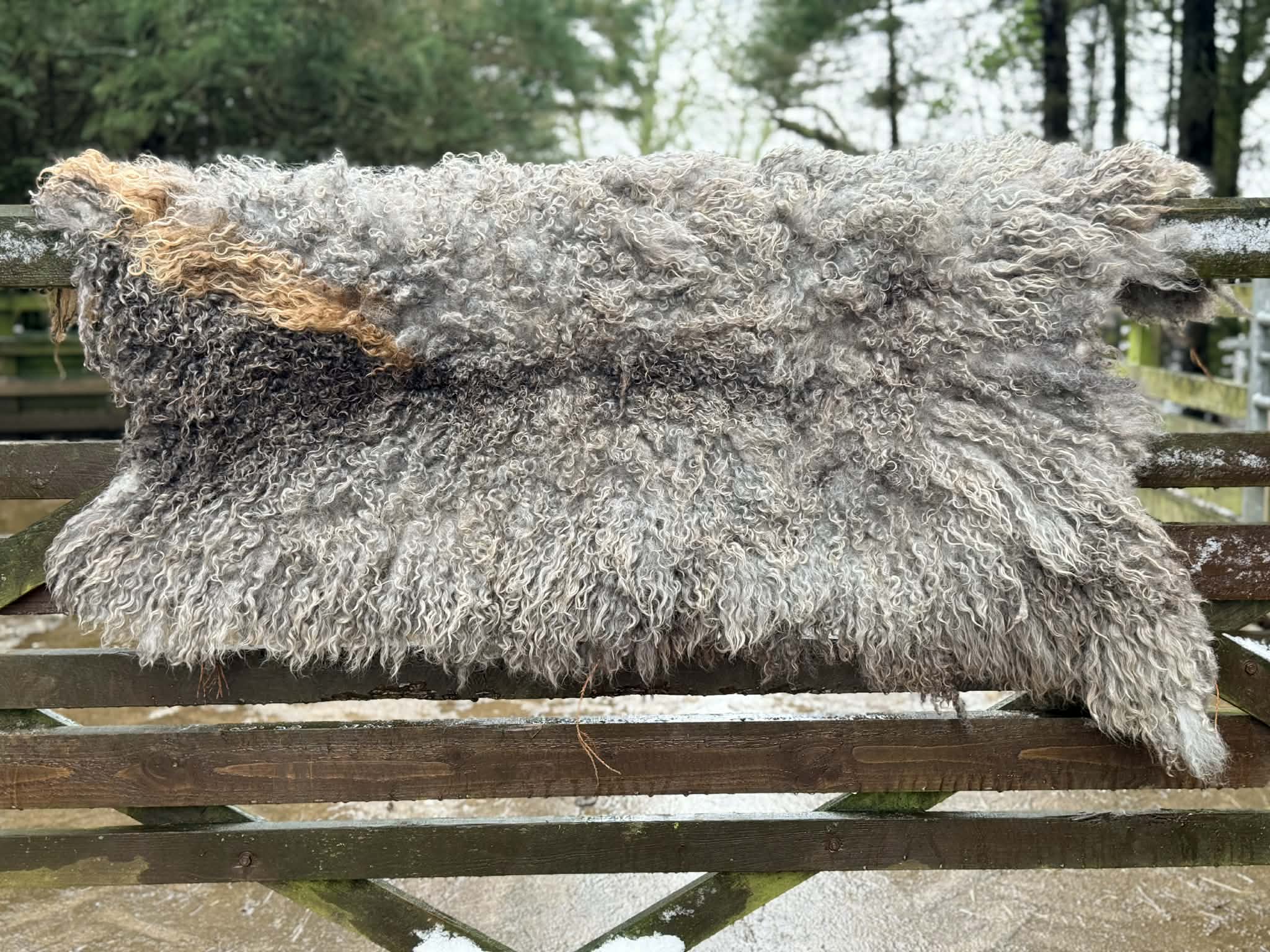 Every year their fleece changes colour, last years shear is much lighter, a stunning rug, for some reason nova acquired a brown stripe over the years. This fleece was her last years shear 2025