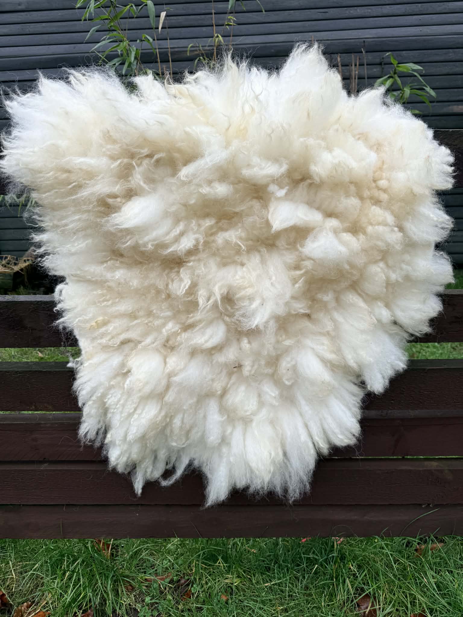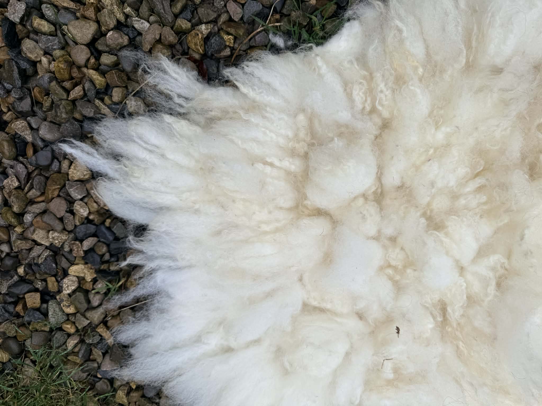 The rug is then skirted, removing as much hay etc as possible from it, along with any dirty fleece. Its prepared and then hand felted using online soap and water. The process is very labour intensive.